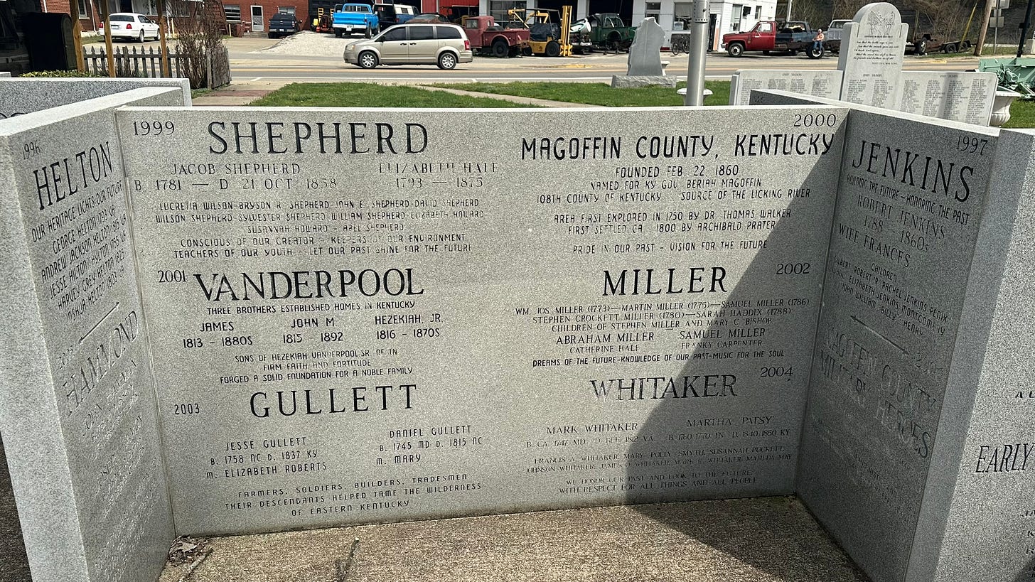 We visited a similar attraction, the Magoffin County Pioneer Village at Salyersville. It was closed at the time, but the site was open to wander between the relocated log cabins, barns and chapels. At its entrance stands a monument to the pioneer families of the district – Shepherd, Vanderpool, Gullett, Miller, Whitaker, Jenkins, Salyer and others – some of whom are still present in Magoffin County today.